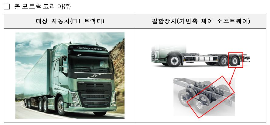 볼보트럭코리아 FH 트랙터 등 2개 차종 3095대는 가변축 제어 소프트웨어 설정 오류로 가변축의 자동 하강이 지연되는 안전기준 부적합 사항이 확인됐다. 국토부는 추후 시정률 등을 감안해 과징금을 부과할 계획이다. 해당 차량은 10일부터 공식 서비스센터에서 무상으로 수리를 받을 수 있다.