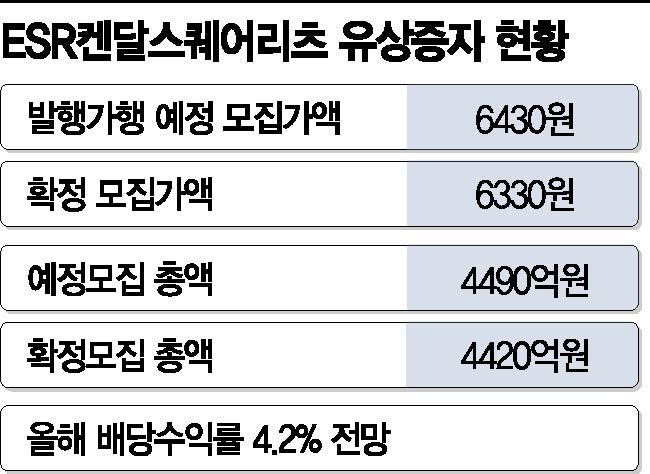 ESR켄달스퀘어리츠는 이날까지 4420억원 규모의 유상증자를 위한 구주주 청약을 진행한다. 신주 발행가는 6330원으로 확정됐다. 8일 종가 6350원과 비교하면 신주 청약의 가격 매력은 낮다. 이날 시초가는 6330원으로 장 초반 6320원도 기록했다. 오전 9시10분 기준 6330원에 머물렀다.