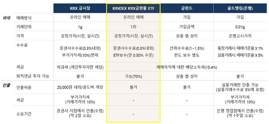 투자자가 금 현물에 투자할 수 있는 방법은 KRX금시장을 통한 현물 거래, 금 현물 ETF 활용, 금펀드나 골드뱅킹 가입 등으로 다양하다. KRX금시장에서의 매매차익은 양도소득세 및 배당소득세 과세 대상이 아니어서 거래비용 면에서의 장점이 크다. 다만 퇴직연금 계좌를 통해 KRX금시장 금 현물을 거래하는 것은 불가능해 다른 대안이 필요했다.