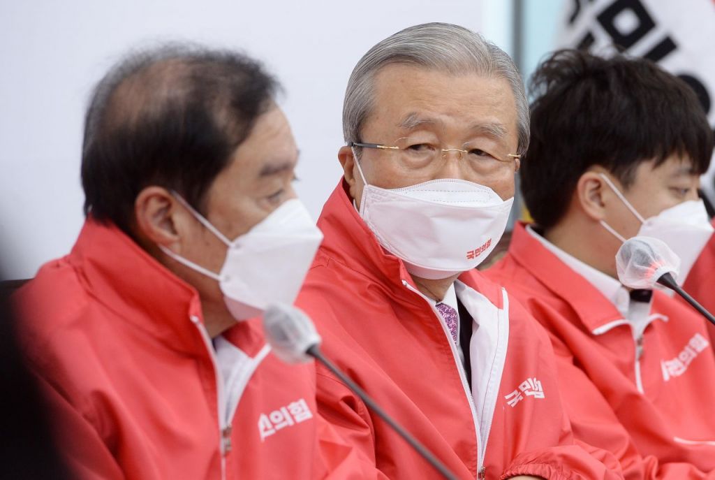김종인 국민의힘 총괄선대위원장이 13일 오전 국회에서 열린 중앙선거대책위원회의에서 김병준 공동상임선대위원장의 발언을 듣고 있다. [이미지출처=연합뉴스]