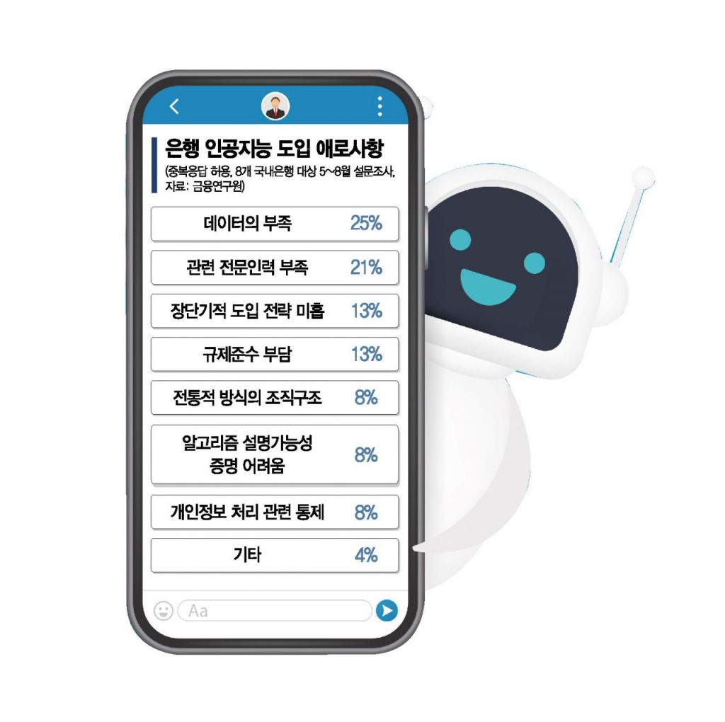 은행권은 AI 활용에 챗봇 투자를 일순위로 꼽고 있다. 한국금융연구원이 올해 5~8월 중 8개 국내은행을 대상으로 AI 활용에 대해 조사한 결과 향후 추가적인 투자 계획을 갖고 있는 분야로는 챗봇이 가장 많았으며 다음으로 신용평가, 대출심사, 금융자산 추천 및 관리, 디지털 마케팅 등 순이었다. 다만 AI 도입상 직면하는 애로사항으로는 데이터의 부족(25%), 관련 전문인력 부족(21%), 장단기적 도입 전략 미흡(13%) 등이 거론됐다.