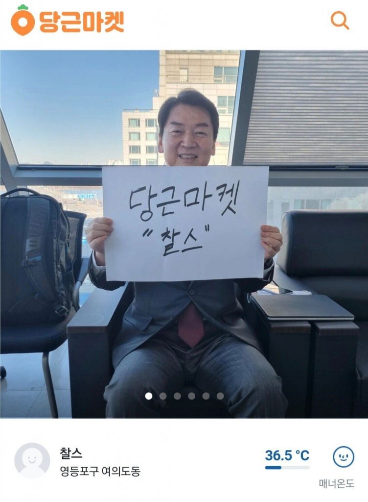 안 후보는 '당근마켓 찰스'라는 문구가 쓰인 팻말을 든 자신의 사진을 함께 게재하면서 "진짜 안철수 맞다"라고 강조하기도 했다.