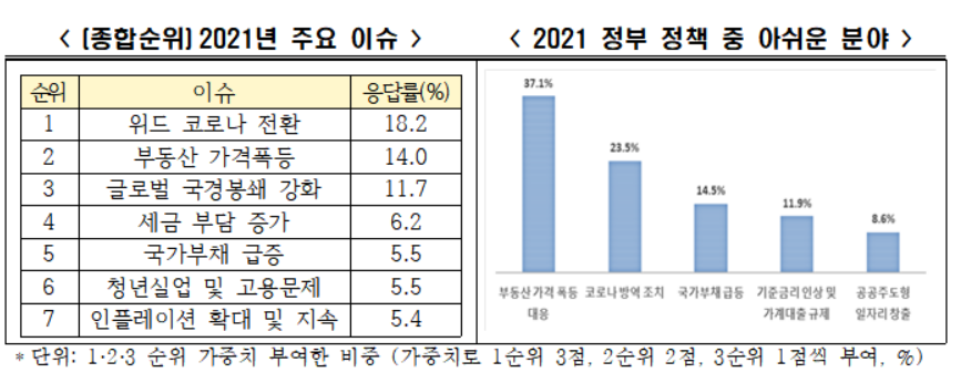 우선 모든 분야를 망라한 종합순위에서는 '위드 코로나 전환에 따른 확진자 급증'이 1순위(18.2%), '코로나 변이 확산에 따른 글로벌 국경봉쇄 강화'가 3순위(11.7%)로 나타나 코로나19 관련 답변이 29.9%로 가장 높은 응답률을 기록했다. 2순위는 '부동산 가격폭등 및 관련 스캔들(LH직원 부동산 투기 등)'로 14.0%의 응답률을 보였으며 뒤이어 '세금 부담 증가'(6.2%) 등 국민들의 먹고 사는 문제가 주요 이슈로 꼽혔다.