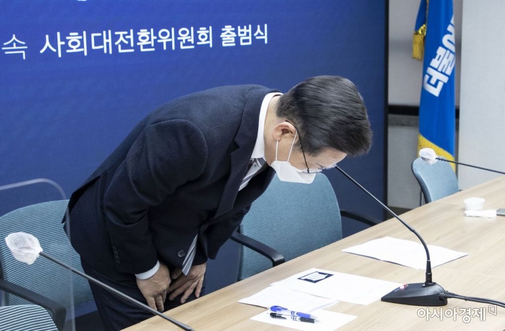 이재명 더불어민주당 대선 후보가 16일 서울 여의도 중앙당사에서 열린 사회대전환위원회 출범식을 마친 뒤 아들 도박 의혹 관련 사과 발언 후 고개를 숙이고 있다./윤동주 기자 doso7@