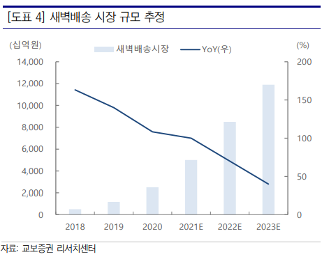 19일 정소연 교보증권 연구원은 "새벽배송의 지속가능한 성장을 전망한다"며 "새벽배송 시장은 2020년 2조5000억원 규모로 추정되는데 2023년까지 11조9000억원 규모로 성장하면서 온라인 식품 시장의 성장을 주도할 전망"이라고 밝혔다. 전체 식품 시장에서 8.7%, 온라인 식품 시장에서 29.3%의 점유율을 뜻한다. 새벽배송이 식품의 메인 라스트 마일(Last mile) 방식으로 자리할 것이란 판단이다.