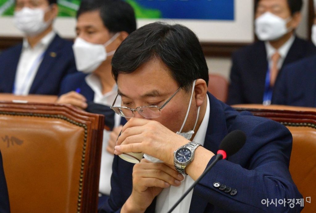 구본환 전 인천공항공사 사장이 지난해 8월 국회에서 열린 국토교통위 전체회의에 출석, 속이 타는 듯 물을 마시고 있다./윤동주 기자 doso7@