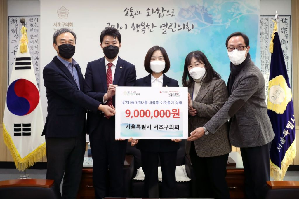기부금은 부의장 업무추진비를 절약하여 마련한 것으로 지난해 662만원을 기부한 데 이어 올해는 양재1·2동, 내곡동에 각 300만원씩 총 900만원을 기부했다. 제8대 서초구의회가 어려운 이웃에게 희망이 되고, 지역사회에 따뜻한 나눔 문화가 자리 잡기를 바라는 마음으로 2년째 기부를 진행하고 있다. 성금은 사회복지공동모금회 서울특별시지회 계좌에 입금 후 지역내 저소득 소외계층에게 전달될 예정이다.