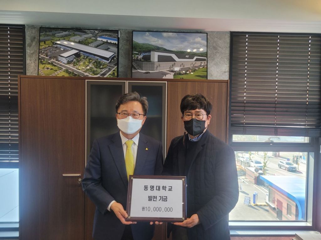 동명대학교 전호환 총장(왼쪽)과 엠오티 마점래 대표가 발전기금 후원 후 기념사진을 찍고 있다.
