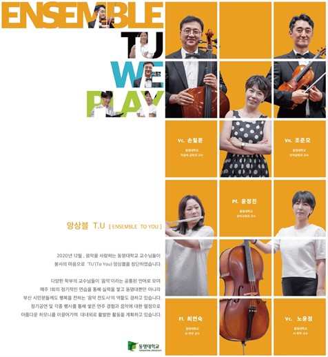동명대 앙상블 T.U는 피아노 5중주로 ▲고향의 봄 ▲크리스마스메들리 등 연주로 새해 희망을 부른다. 음악 전공자가 아닌 손일문(자동차공학과), 윤정진(유아교육과), 조준모(전자공학과), 최언숙·노윤정(AI 학부), 이강혁(게임공학과) 교수가 무대에 오른다.