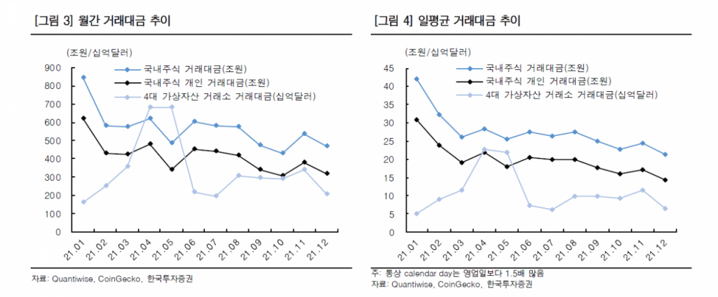 한편 가상자산 거래 규모는 꾸준히 증가했다. 올해 개인 주식 거래대금은 4936조원, 일평균 19조9000억원 수준으로 예상된다. 국내 4대 가상자산 거래소는 연간 거래대금 4조달러(4750조원), 일평균 109억달러다. 지난해 말 대비 개인 가상자산 보유액이 50조원 가량 증가한 것으로 추정된다. 규모 측면에서는 제도권 증시와 경쟁관계로 볼 수 있다는 것이다.