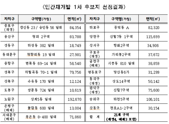 당초 서울시는 지역균형발전과 자치구 상황 등을 고려해 자치구별 1곳씩, 총 25곳을 선정할 계획이었으나 심사를 통해 중구·광진구·강남구 등 3개 자치구는 제외됐다. 이에따라 강남구의 마지막 재개발 지역으로 꼽히는 일원동 대청마을도 후보지에서 탈락했다. 서울시 관계자는 "지구단위계획 등과의 정합성에 부합하지 않거나 현금청산자·공모반대 등 주민갈등 문제가 있어 사업 실현가능성이 떨어진다고 판단된 지역"이라고 설명했다.