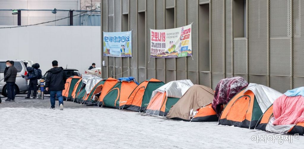 전국이 연일 영하권 날씨가 이어지고 있는 29일 서울역 광장에 코로나19 재택치료가 필요한 노숙인 수용을 위한 텐트가 설치돼 있다./강진형 기자aymsdream@