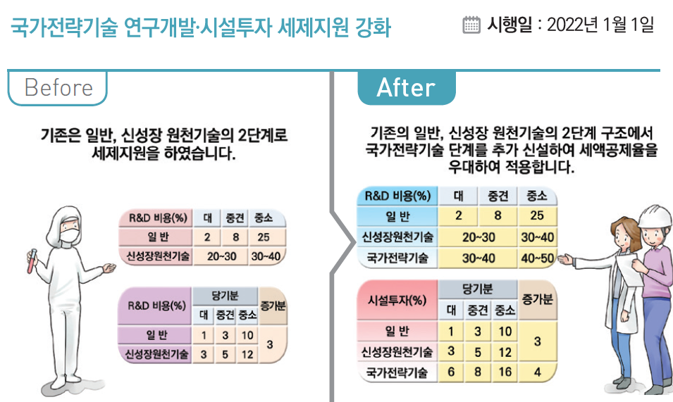 내년 신설되는 '국가전략기술' 세액공제는 글로벌 기술패권에 대응하기 위해 국가경제안보와 직결되는 핵심 기술을 집중 육성하기 위한 제도다. 3대 분야 65개 기술을 오는 2월 중 국가전략기술로 지정하고 관련 R&D 비용에 대해 대·중견기업은 30~40%, 중소기업은 40~50%의 세액공제율을 적용한다. 기존 신성장·원천기술 세액공제율(대·중견기업 20~30%, 중소기업 30~40%)보다 10%포인트 상향한 것이다.