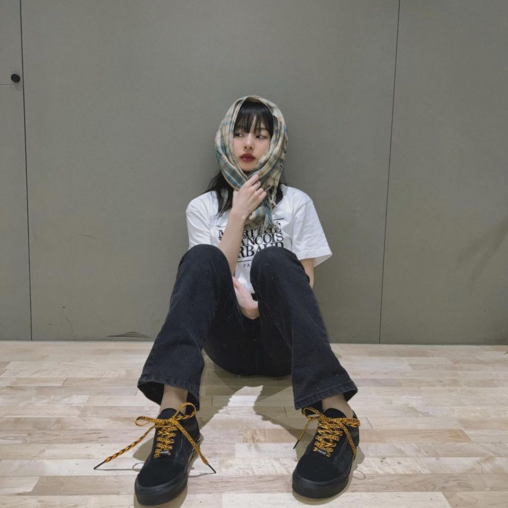 사진 속 노제는 심플한 반팔 티셔츠 차림으로 체크무늬 목도리를 머리에 감싸고 있다.