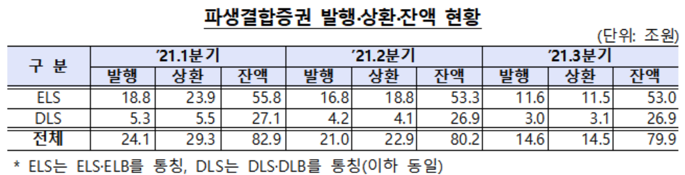 3일 금융감독원이 발표한 '2021년 3분기 중 증권회사 파생결합증권 발행·운용 현황'에 따르면 3분기 중 발행잔액은 79조9000억원으로 집계됐다. 직전 분기 80조2000억원과 비교해 0.37%(3000억원) 감소했다. 금감원 관계자는 "3분기 파생결합증권 신규발행은 14조6000억원이며 이는 코로나 직후인 작년 2분기 15조8000억원 보다도 적은 금액으로 HSCEI 지수 하락 및 조기상환 지연 등으로 파생결합증권 수요가 위축된 영향"이라고 설명했다.