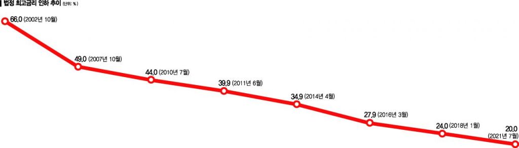 법정 최고금리는 그간 꾸준히 인하돼왔습니다. 2000년대 초반만 해도 법정 최고금리는 66%에 달했습니다. 지속적으로 내린 최고금리는 2011년 39%, 2014년 34.9%, 2016년 27.9%, 2018년에는 24%로 낮아졌죠. 지난해 7월에는 연 20%로 내려갔어요. 문재인 정부 들어 4년 만에 약 8%포인트가 낮아진 겁니다.