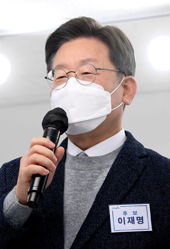이재명 더불어민주당 대선 후보가 2일 서울 마포구 소재 더불어민주당 미래당사 '블루소다' 개관식에 참석, 축사를 하고 있다. [이미지출처=연합뉴스]