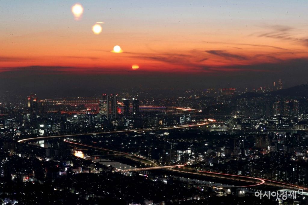 서울 중랑구 용마산 정상에서 바라본 도심에 해가 저물어가고 있다. 부동산 가격 폭등, 코스피 3000시대, 지구촌 달군 K-컬처, 누리호 첫 발사, 코로나19 변이 바이러스로 일상 회복 중단 등 다사다난했던 한 해였다. 새해에는 큰 바다를 향해 나아가는 강줄기처럼 더 나은 세상으로 나아가는 대한민국이 되기를 바란다. /문호남 기자 munonam@