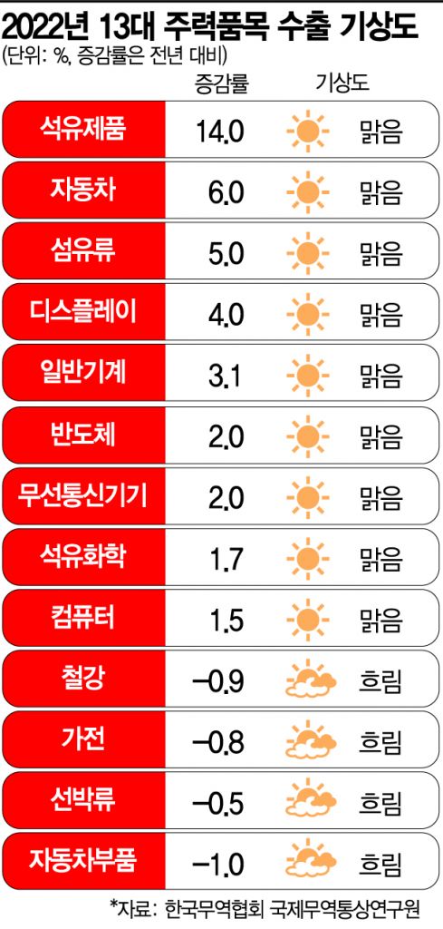 통상연구원에 따르면 반도체와 디스플레이 등 ICT, 석유화학, 일반기계 제품의 수출이 호조를 보일 것으로 예상된다. 특히 반도체 수출은 전년 대비 2.0% 증가한 1255억달러를 기록할 전망이다. 파운드리(반도체 위탁생산) 단가 상승과 생산능력 확대로 시스템반도체 수출이 늘어날 가능성이 크기 때문이다. 석유화학 수출은 전년 대비 1.7% 증가한 557억달러를 예상했다. 반면 13대 주력 품목 가운데 철강(-9.0)과 자동차부품(-1.0), 선박류(-5.0), 가전(-8.0) 등은 단가 하락과 반도체 공급난, 수주 감소, 해외 생산 확대 등의 여파로 수출 부진 가능성이 점쳐진다.