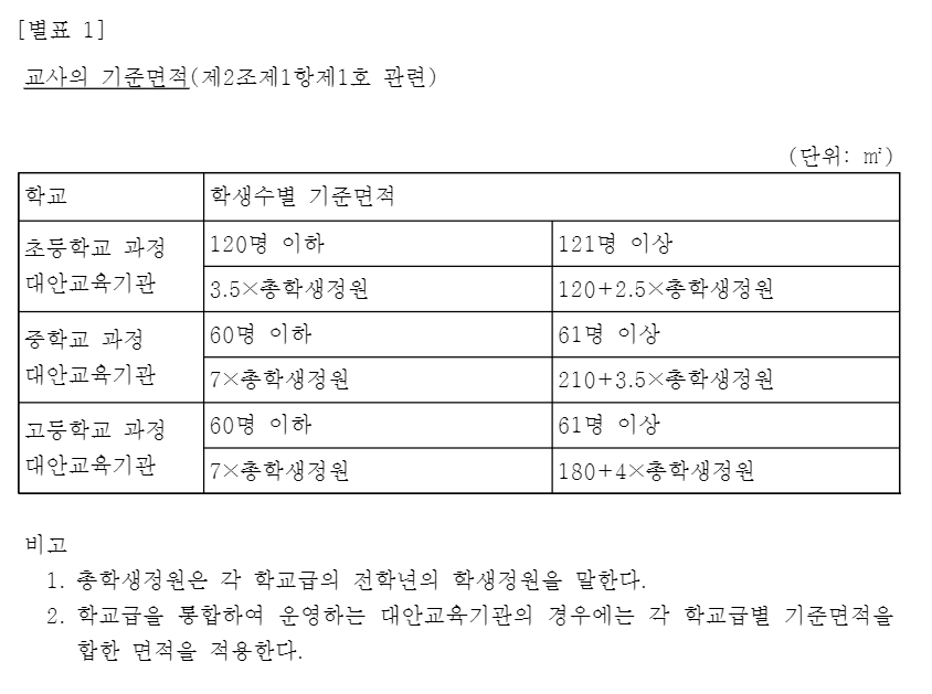 중학교 과정 대안교육기관에서 60명 이하인 경우 총 학생 정원에 7을 곱하고, 61명 이상이면 총 학생 정원에 3.5를 곱한 후 210을 더한다. 고등학교 과정 대안교육기관에서의 기준면적은 60명 이하인 경우 중학교와 같고 61명 이상이면 학생정원에 4를 곱한 후 180을 더해야 한다.
