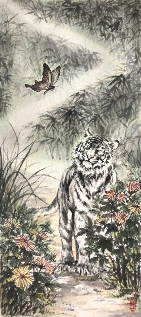 이번 전시에서 백서진 작가는 ‘호(虎)’(2021) 시리즈 연작을 선보인다. 화선지에 수묵을 쓴 그림에서 검은 호랑이의 강인함과 한국적 전통미가 전해진다. 꽃밭에서 나비를 바라보는 호랑이를 수묵채색화로 그린 작품은 동심의 세계로 온 듯 편안한 느낌을 준다. 이태호 작가는 357년 축조된 고구려 고분인 안악 3호분의 벽화에 그려진 호랑이에 주목했다. 이 벽화는 한국미술사 최초의 호랑이 그림으로 추정된다. 이 작가는 이곳에 그려진 호랑이 얼굴과 넝쿨 무늬를 수묵담채화로 표현한 ‘고구려 넝쿨 무늬와 호랑이 얼굴’(2020)을 이번 전시에 출품했다.