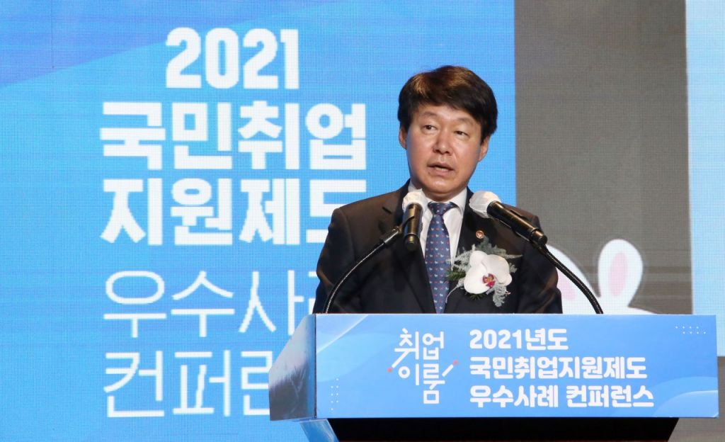 안경덕 고용노동부 장관이 지난달 2일 서울 웨스틴조선호텔에서 열린 2021년도 국민취업지원제도 우수사례 콘퍼런스에서 인사말을 하는 모습.(이미지 출처=연합뉴스)