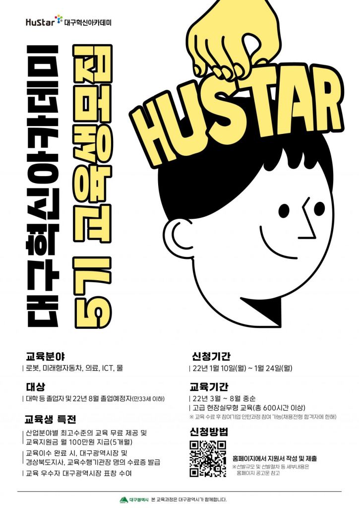 대구시는 우수 청년을 모집하기 위해 휴스타(HuStar) 대구혁신아카데미 5기 교육생을 선발한다고 6일 밝혔다.