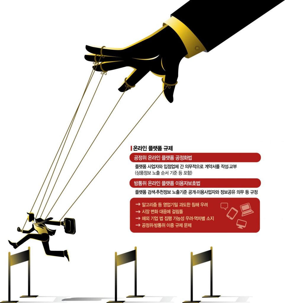 글로벌 IT 공룡 구글이 전 세계 시장을 장악하고 있는 상황에서 한국은 자국의 토종 플랫폼이 강세를 보이는 몇 안 되는 국가다. 특히 네이버·카카오 등 국내에서 입지를 다진 플랫폼들은 최근 글로벌 사업을 확장하면서 해외 기업들과의 경쟁에 나섰다. 하지만 중요한 시기에 정부 규제로 비용과 인력을 낭비해야 할 것을 우려하고 있다. 플랫폼 사업은 시장 변화에 빠르게 대응해야 하는 특징이 있는데, 정부가 플랫폼 노출 방식 등 비즈니스적 요소들을 계약서에 필수적으로 기재할 것을 강제하게 되면 변화에 치밀하게 반응하기가 어렵다는 것이다.