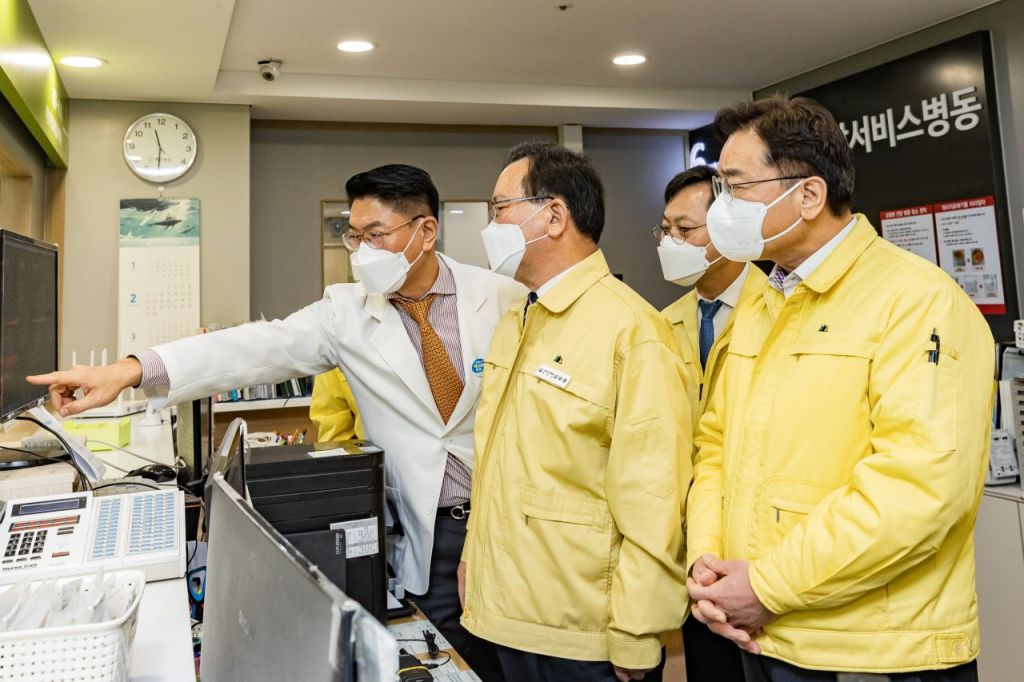 김부겸 총리와 김선갑 구청장은 김병관 혜민병원장에게 코로나19 거점 전담병원 운영 관련 설명을 듣고, 의료 종사자를 격려하는 시간을 가졌다.