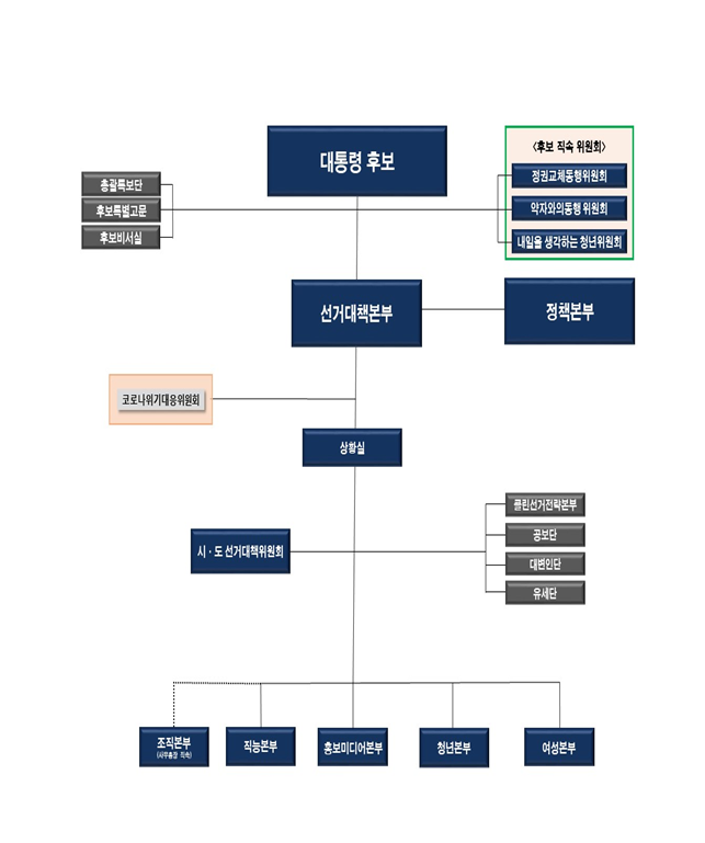 선대본은 6개 총괄본부를 선거대책본부, 정책본부 2개 본부 중심으로 개편해 기능을 집중하기로 했다. 또 기존 후보 비서실이 담당했던 일정·메시지 기능을 선대본으로 이관하기로 결정했다.