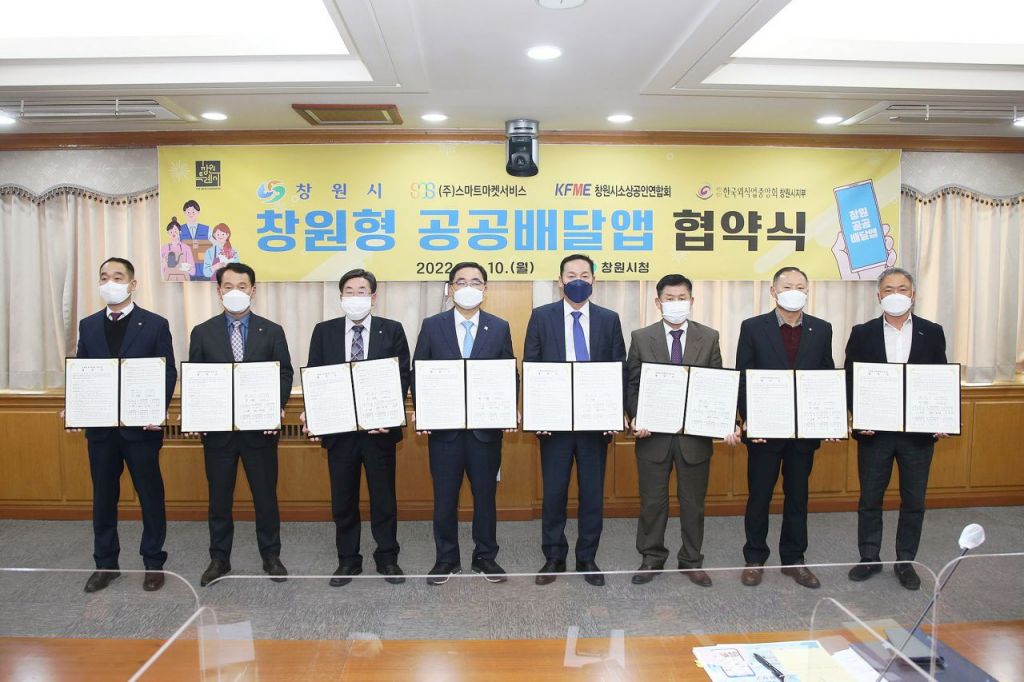경남 창원시는 10일 소상공인의 배달앱 중개 수수료 절감을 위해 스마트마켓서비스와 창원시소상공인연합회, 한국외식업중앙회 창원시 5개구 지부 등과 ‘창원형 공공배달앱’ 운영사업 업무협약을 했다.
