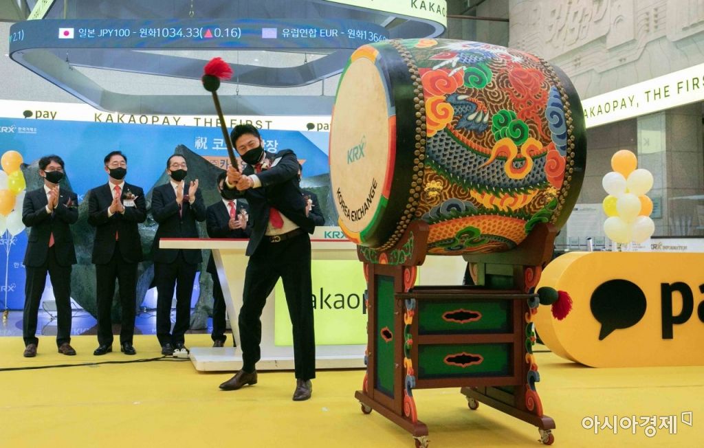 류영준 카카오페이 대표이사가 3일 서울 여의도 한국거래소에서 열린 카카오페이 코스피 상장식에서 타북을 하고 있다./강진형 기자aymsdream@