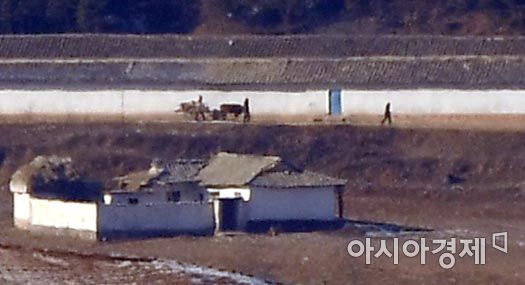 북한이 탄도미사일로 추정되는 발사체를 엿새 만에 다시 발사한 11일 경기 파주시 오두산 통일전망대에서 얼어 붙은 임진강 너머로 북한 황해북도 개풍군 마을에 주민들이 보이고 있다./파주=김현민 기자 kimhyun81@