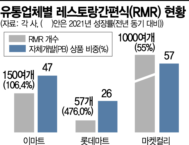 롯데마트도 지난해 RMR 매출 신장률이 476.0%로 급성장했다. PB 상품의 역할이 컸다. 롯데마트는 현재 운영하고 있는 57개 RMR 가운데 15개(26.3%)가 PB 상품으로 ‘요리하다×다리집 떡볶이’(부산), ‘요리하다×오근내 닭갈비’(강원 춘천) 등이 대표 상품이다. 이달 쌀국수 맛집 ‘미분당’과 협업해 ‘요리하다×미분당 쌀국수’를 추가 출시했다.