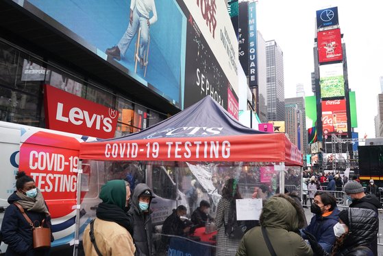 미국 뉴욕의 거리에 설치된 코로나19 검사소 앞에 뉴욕 시민들이 줄을 서고 있다. 사진은 기사의 특정 표현과 관련 없음 /사진=연합뉴스