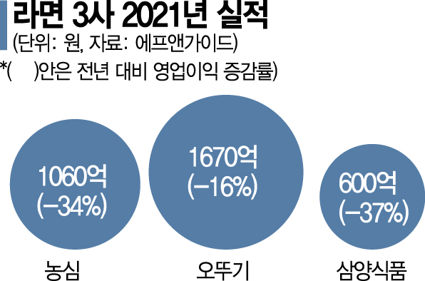 13일 금융정보업체 에프앤가이드에 따르면 라면 3사의 지난해 영업이익은 일제히 뒷걸음질 친 것으로 전망됐다. 농심의 영업이익은 지난해 1060억원으로 전년 대비 35% 감소한 것으로 집계됐다. 오뚜기는 16% 감소한 1670억원, 삼양식품은 37% 줄어든 600억원으로 전망된다.