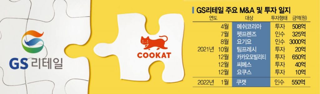 ◆쿠캣 인수로 MZ세대 정조준 = 13일 GS리테일은 푸드 스타트업 ‘쿠캣’을 550억원에 인수했다. GS리테일은 쿠캣을 자회사로 편입할 예정이며, 경영은 기존 대표이사인 이문주 대표가 계속해서 맡는다.