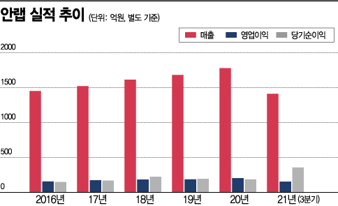 안랩의 매출액은 매년 꾸준히 증가하고 있다. 2015년 별도 기준 1323억원이던 매출액은 2020년 말 기준 1726억원으로 5년 새 30.5% 늘었다. 연평균 매출액 성장률이 5.5%를 기록하며 안정적 성장세를 보였다. 같은 기간 영업이익은 122억원에서 198억원으로 63% 뛰었다. 영업이익 역시 연평균 10.5% 이상으로 꾸준히 증가했다. 영업이익률은 10%대를 이어가고 있다.