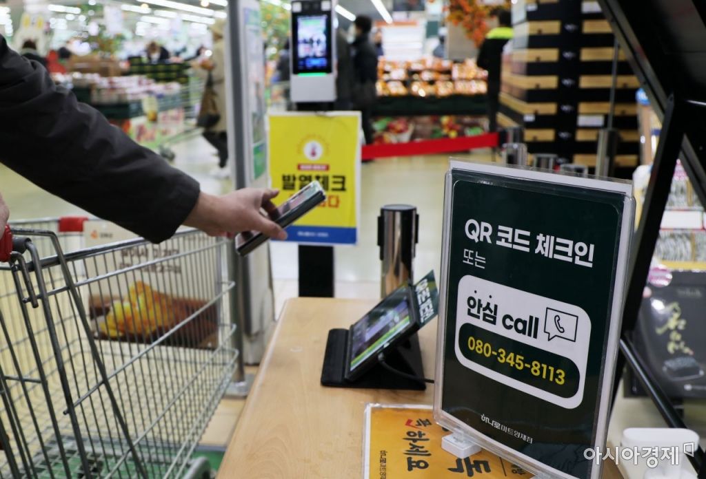 방역패스의 백화점, 대형마트 확대적용을 하루 앞둔 9일 서울 서초구 양재하나라로 마트를 찾은 고객들이 마트 출입 전 QR코드를 통해 백신접종을 확인하고 있다./윤동주 기자 doso7@
