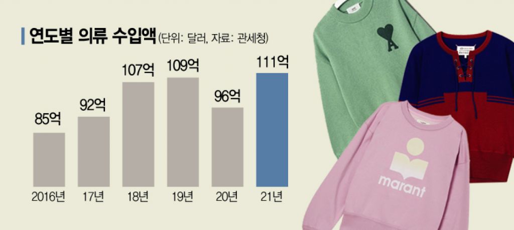 의류 수입이 늘어난 이유는 MZ세대(밀레니얼+Z세대)들 사이에서 국산 브랜드보다 아미, 메종키츠네, 톰브라운, 르메르, 이자벨마랑, 메종마르지엘라 , 아크네스튜디오 등 신명품으로 불리는 해외 컨템포러리 브랜드 선호 현상이 짙어졌기 때문이다.