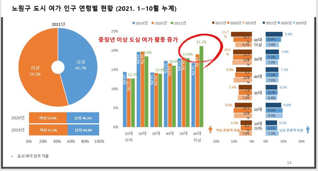 특히 전체 방문객 중 노원구민이 차지하는 비중이 2019년 60%에서 2021년 66.3%로 증가했다. 이는 코로나19 이후 사회적 거리두기 등으로 인해 타 지역 활동을 자제하고 지역 내 근거리에서 여가활동을 선호하게 된 결과로 보인다.