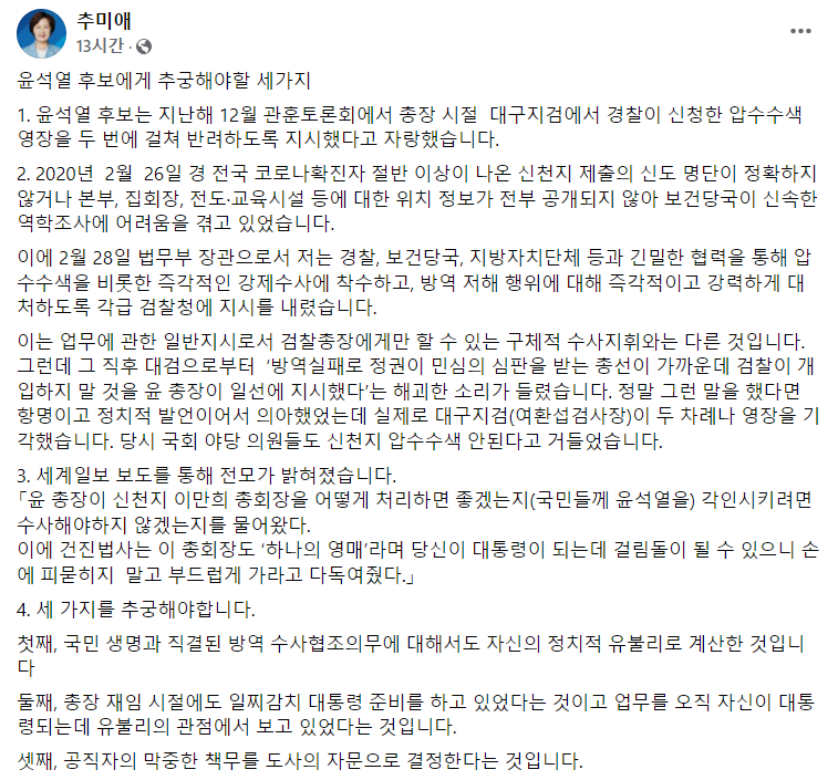 추 전 장관은 "세 가지를 추궁해야 한다"고 촉구했다. 그는 "첫째, 국민 생명과 직결된 방역 수사협조 의무에 대해서도 자신의 정치적 유·불리로 계산했다"며 "둘째, 총장 재임 시절에도 일찌감치 대통령 준비를 하고 있었다는 것이고, 업무를 오직 자신이 대통령 되는데 유·불리의 관점에서 보고 있었다는 것"이라고 지적했다. 또 "공직자의 막중한 책무를 도사의 자문으로 결정한다는 것"이라며 재차 윤 후보의 무속 논란을 강하게 비판했다.