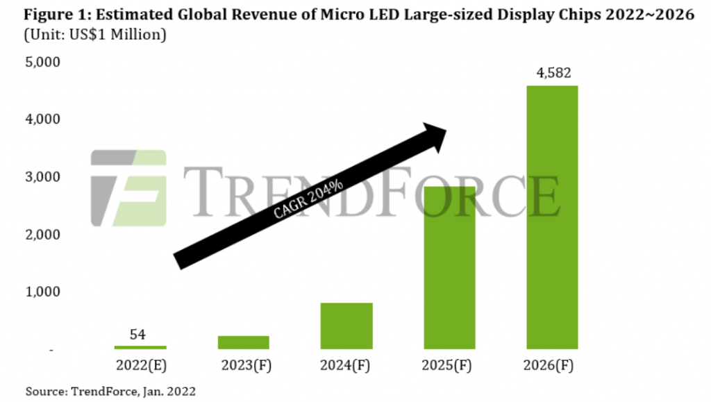 22일 시장조사업체 트렌드포스는 최근 세계 대형 디스플레이용 마이크로 LED 시장이 올해 5400만달러(약 640억원)에서 연간 기준 204%의 성장률을 보이며 2026년 45억8200만달러 수준까지 커질 것으로 전망했다. 트렌드포스는 "대형 디스플레이용 마이크로 LED의 개발은 2026~2030년 정점을 찍을 것"이라고 내다봤다.