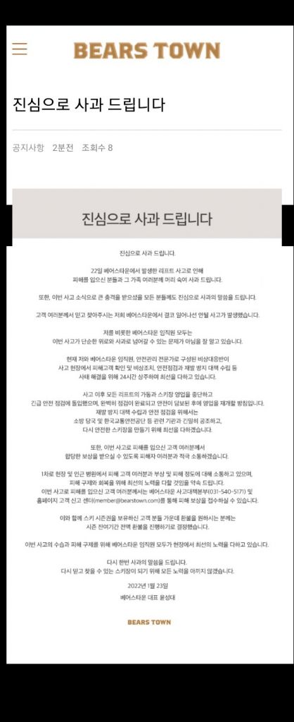 또한 사고 이후 관련된 모든 영업을 중단하고 긴급 점검을 진행 중이며 안전이 담보되면 영업을 재개할 방침이라고 밝혔다. 윤 대표는 "사고로 피해를 입으신 고객분께서는 베어스타운 사고대책본부 및 홈페이지 고객 신고 센터를 통해 피해 보상을 접수할 수 있다"며 "이와 함께 스키 시즌권을 보유하신 고객 분들 가운데 환불을 원하시는 분께는 시즌 잔여기간 환불을 진행하기로 결정했다"고 덧붙였다.