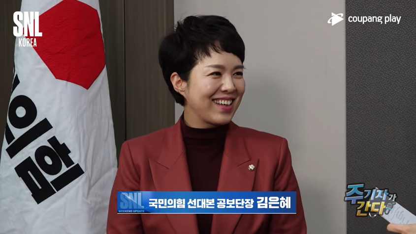 김은혜 국민의힘 선대본부 공보단장이 23일 공개된 온라인 동영상 서비스(OTT) 쿠팡플레이 SNL 코리아의 '주기자가 간다'에 출연해 대선 후보들을 차에 비유했다./사진=유튜브 채널 쿠팡플레이 캡처.