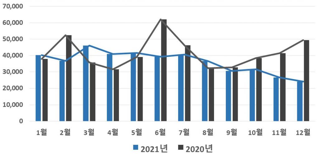 공개된 자료에 따르면 지난해 1월부터 12월까지 거래된 경기도 부동산의 총거래량은 43만5426건으로 2020년 49만9546건과 비교해 12.8% 감소했다.