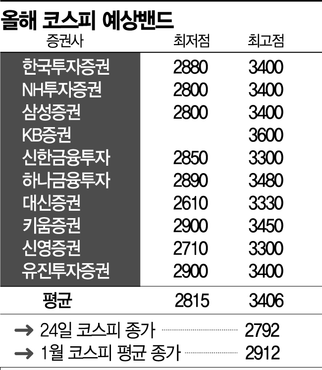 연초 증권가에서는 올해 코스피가 최고 3600까지도 상승할 것으로 봤지만 며칠 사이에 코스피는 2700까지 내리 꽂혔다. 연초에는 못해도 평균 2815면 적정 하단이 될 것으로 봤지만 지난 24일 2792.00까지 잠기면서 어느 때보다 우려가 커졌다.