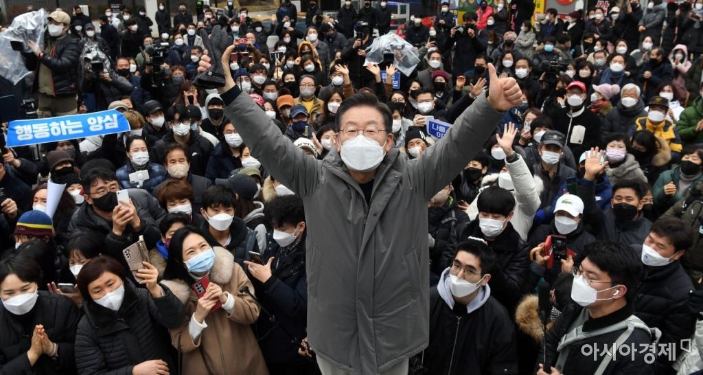 이재명 더불어민주당 대선후보가 25일 경기도 하남시 신장시장을 방문, 지지자들 환호에 화답하고 있다./국회사진기자단