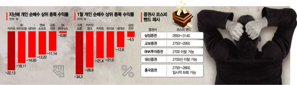 ◆동학개미 수익률 죄다 마이너스= 26일 한국거래소에 따르면 지난해 개인의 순매수 상위 종목은 삼성전자, 현대모비스, 카카오, 현대차, SK하이닉스, LG전자, 네이버, SK바이오팜, 금호석유, 엔씨소프트 등으로 수익률(지난달 말과 이달 25일 종가 기준)은 죄다 마이너스로 추정된다. 카카오는 -22.13%에 달하고 SK바이오팜, 네이버, 엔씨소프트, 금호석유 등도 각각 -18.11%, -14.93%, -13.22%, -11.14%로 두자릿수다.
