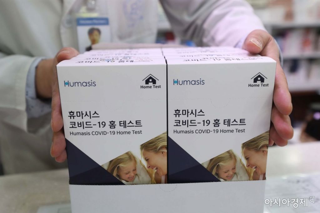 휴마시스 코로나19 자가검사용 진단키트 '휴마시스 코비드-19 홈테스트'가 3일 서울 시내 한 약국에서 판매되고 있다. 자가검사키트는 직접 콧속(비강)에서 채취한 검체를 키트에 떨어뜨려 양성·음성 여부를 확인하는 방식이다. 감염여부는 15~30분 안에 눈으로 확인 가능하다. 키트에 붉은색 두 줄(대조선C, 시험선T)이 나타나면 양성이다. 이 경우 반드시 방역당국이 운영중인 선별진료소를 방문해 기존의 검사법인 유전자 증폭(PCR) 검사를 받아야 한다. /문호남 기자 munonam@